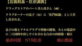 アナル 【18禁エロマンガ】【近親相姦・肛虐調教】 ドラッグストアのパート美人母さん(48)、 クラブオーナーの息子(21)に「肛門奴●」として差し出される。 息子の指とアナルプラグで背徳の開発、夫との電話中に二穴同時中出しでイかされる白衣の肉便器・菊江(d_703528)